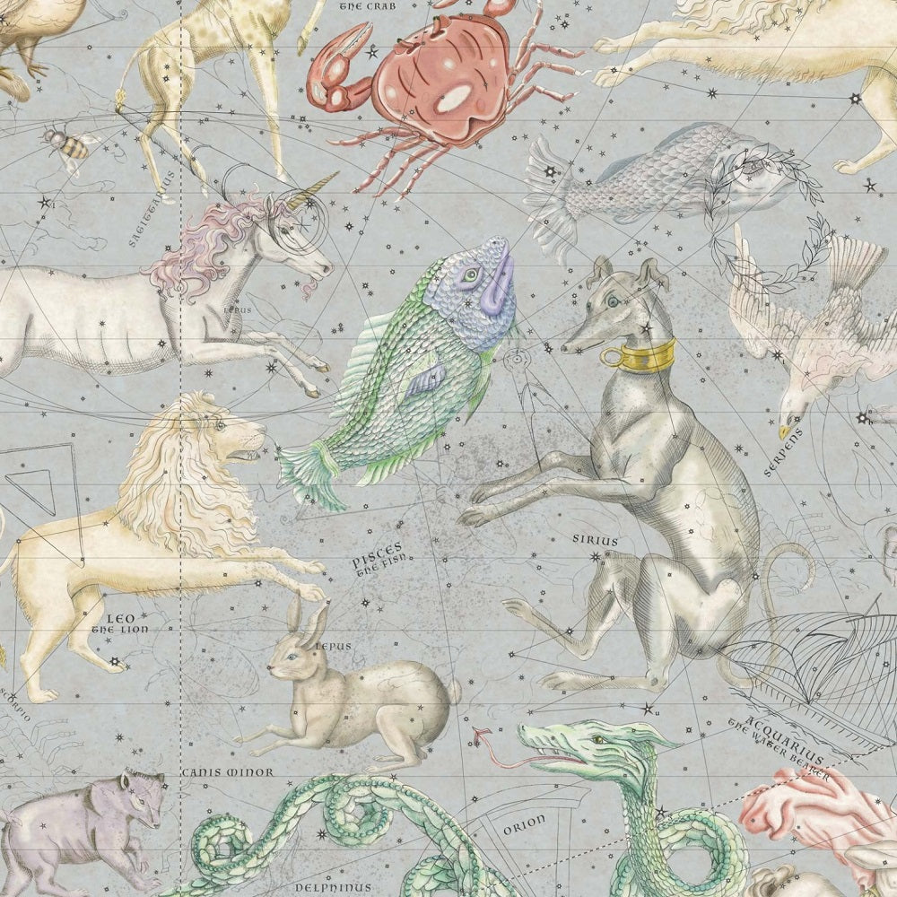'Cosmos' is a zodiac-inspired wallpaper, hand illustrated with animals from the twelve astrological signs. The pattern also has star constellations such as the Pegasus, Canis Major and Ursa Minor. The inspiration for this design comes from antique maps of the galaxy.