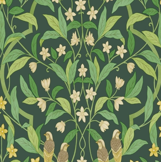 At once sprawling and serene, Jasmine & Serin Symphony is a contemporary update of a graceful Arts and Crafts-style print. Depicting ethereal birds perched among trailing jasmine vines, its flora and fauna create a subtle ombré as the design fans in gentle arcs across the wall.