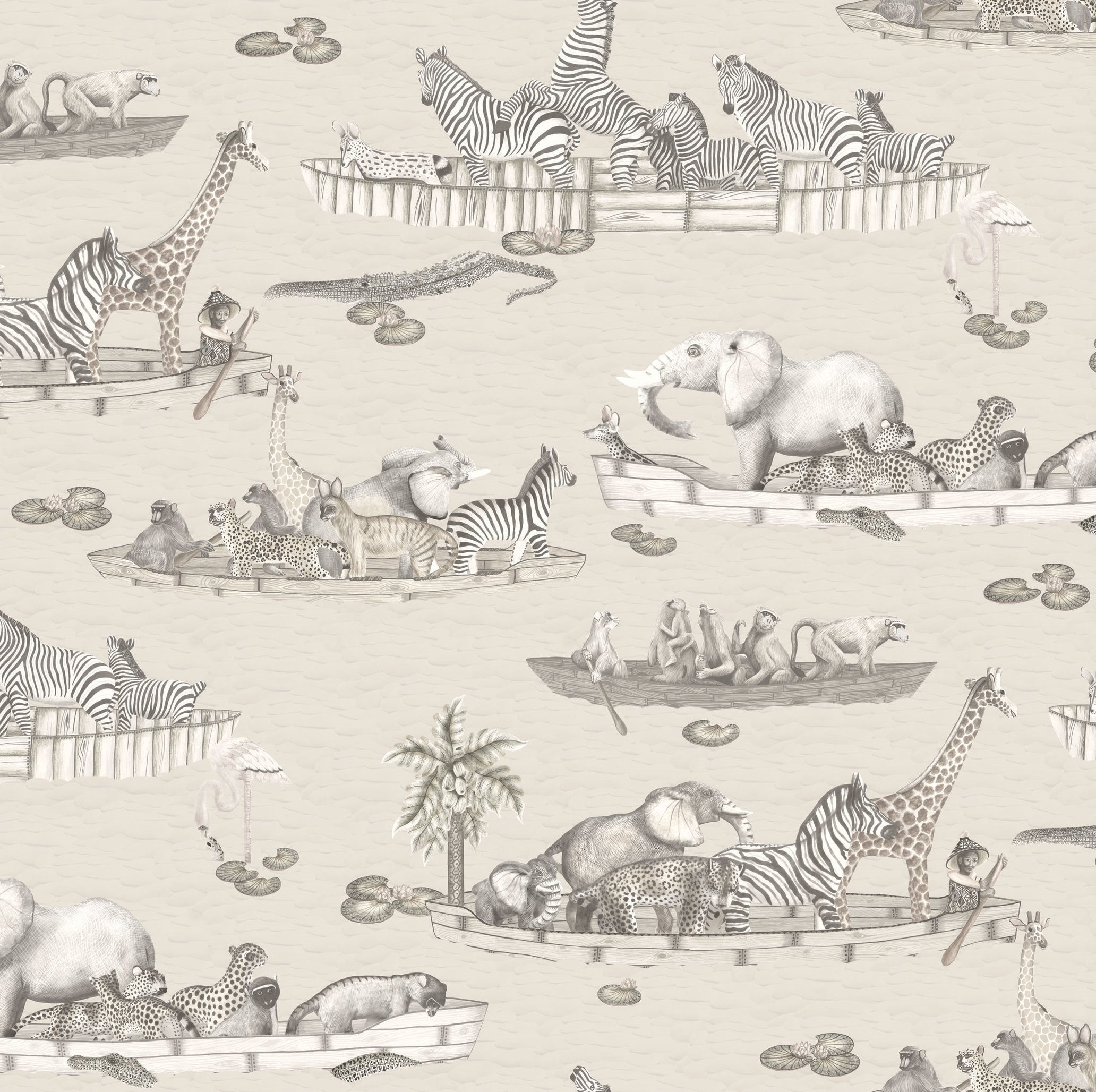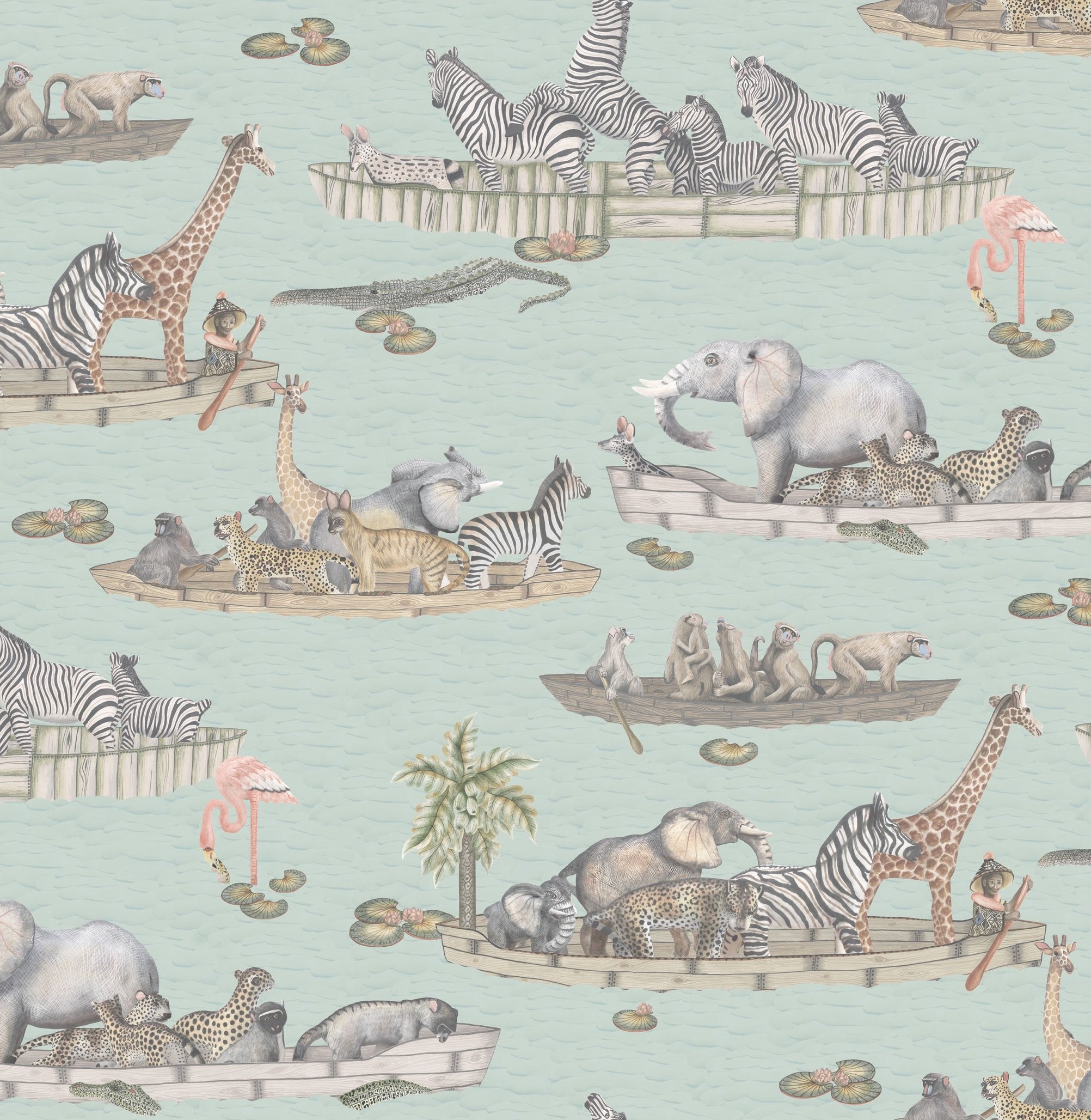 Zambezi features a flotilla of boats captained by an array of animals all floating gently down the Zambezi river in Zimbabwe. Inspired by a mission led by people in boats to save drowning animals when the Zambezi flooded in the 1960s, this delightful wallpaper will be loved by children and adults alike. Softly coloured zebras, monkeys, elephants and hyenas all feature as do the occasional crocodile and haughty flamingo.