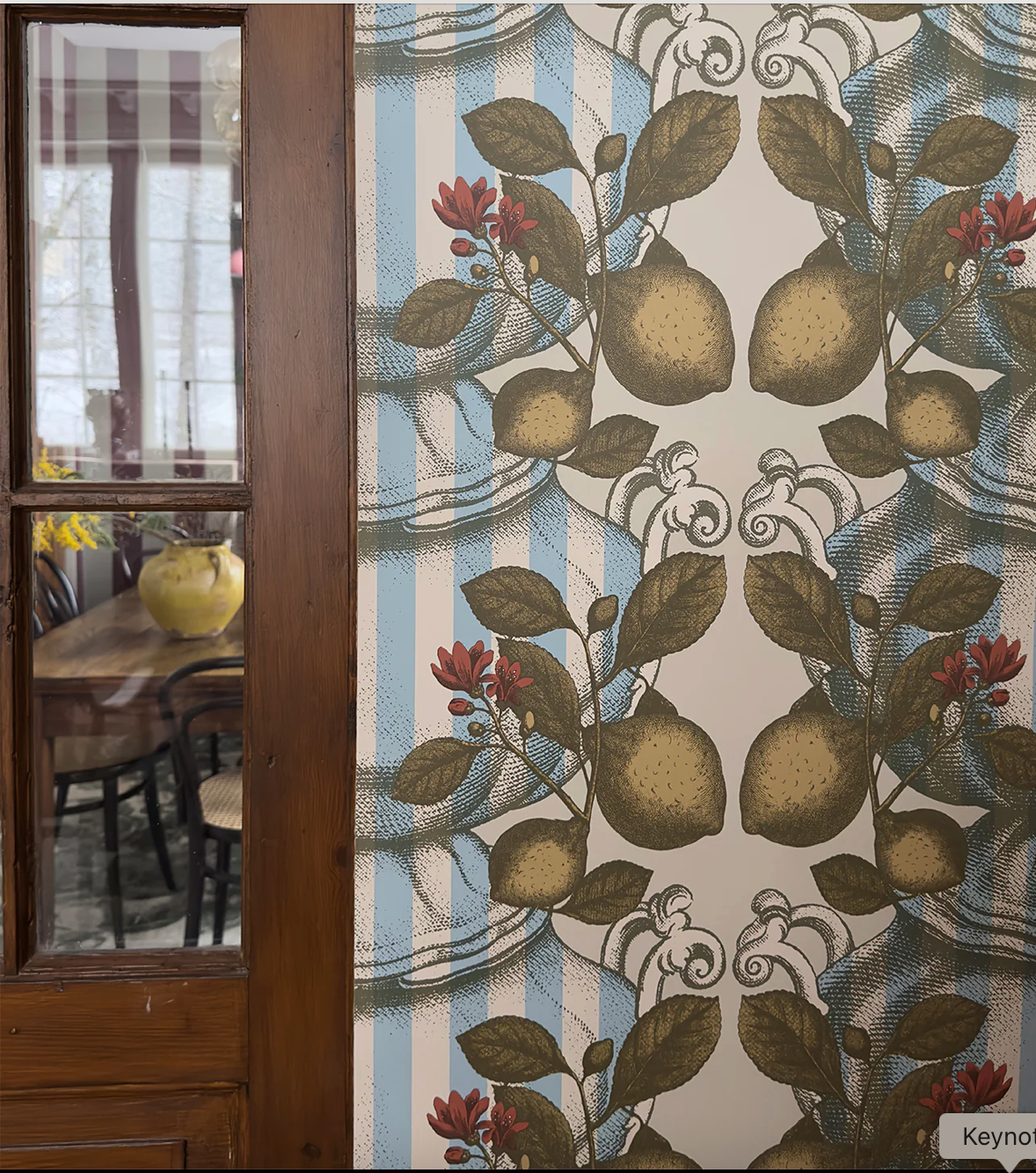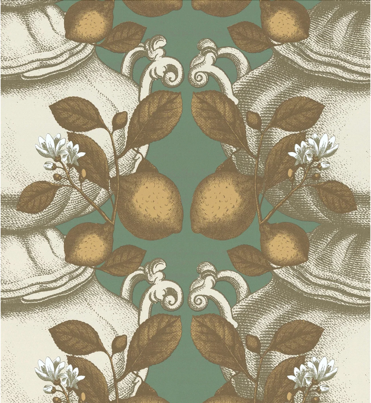 Large ceramic vessels are overflowing with beautiful lemons in this classical style wallpaper. Picture yourself in the Italian countryside with the bounty of lemons at your disposal and to be used in everything from your cuisine to your aperitif. Life is good in the Mediterranean.Â
