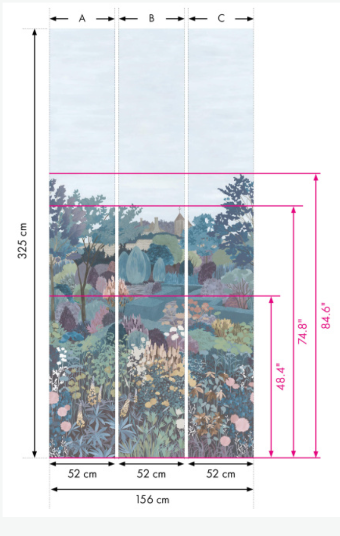 • Roll Size: Each roll has 3 panels. Each Panel is 20.5" wide x  10'8" high. The panel set ( total width 61.5") can be repeated around the room to the desired width