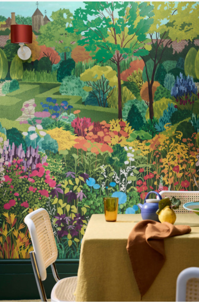 This vibrant mural is inspired by layered blooms from classic English gardens.