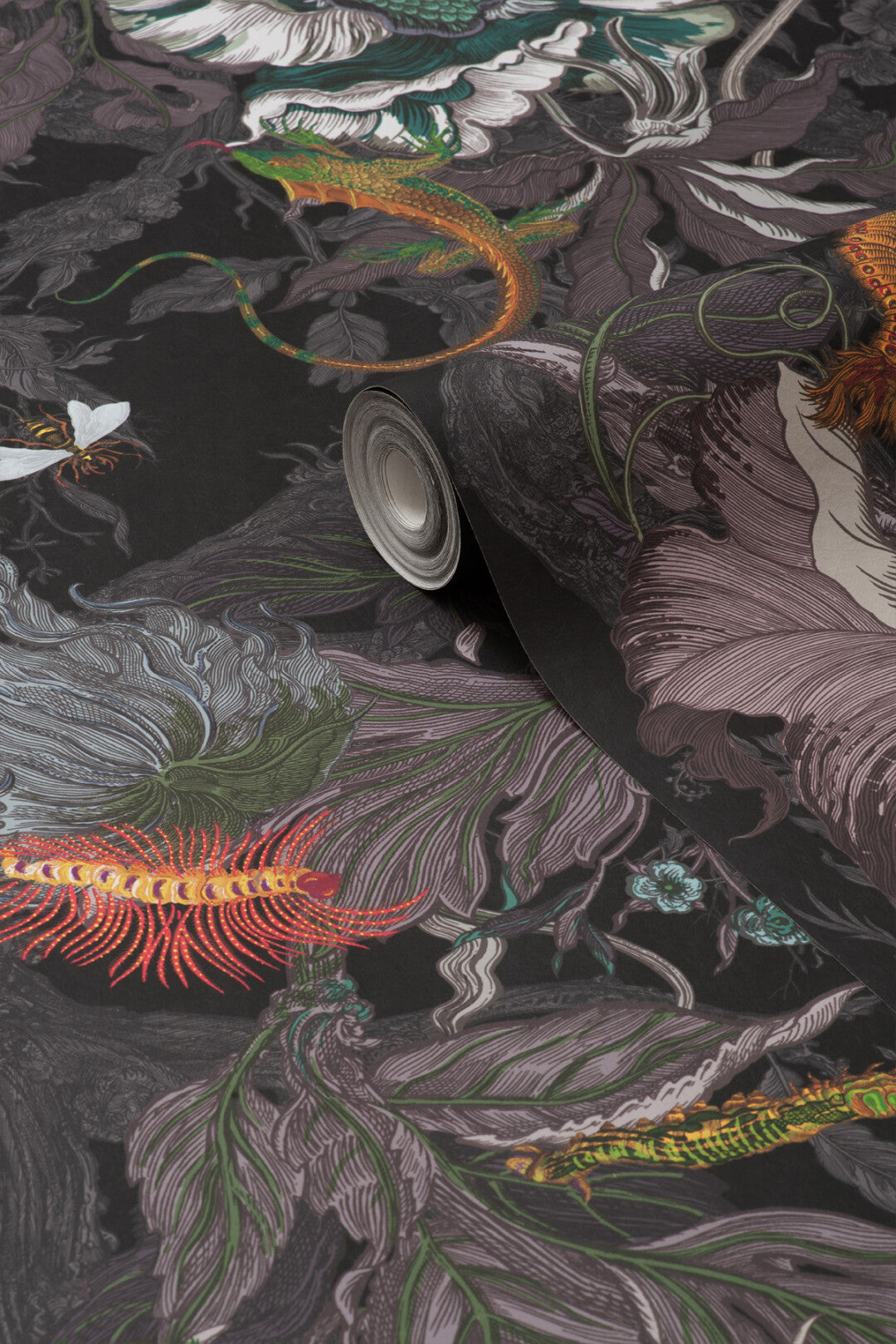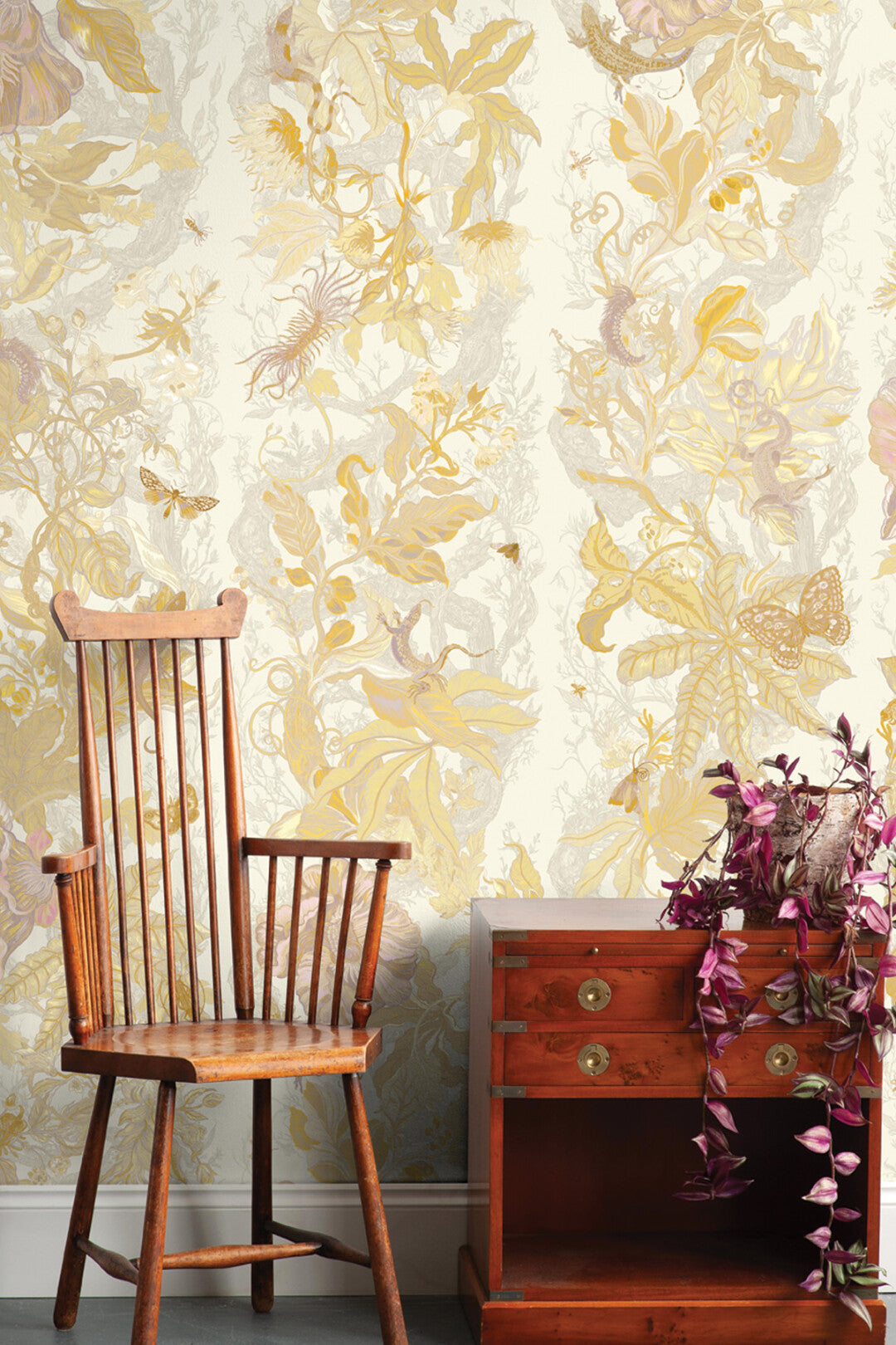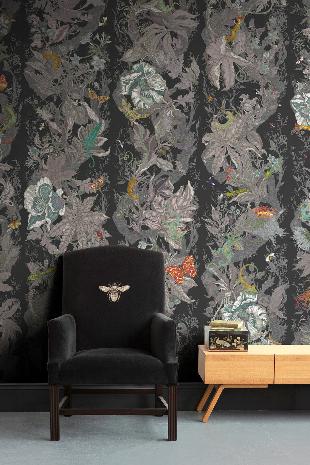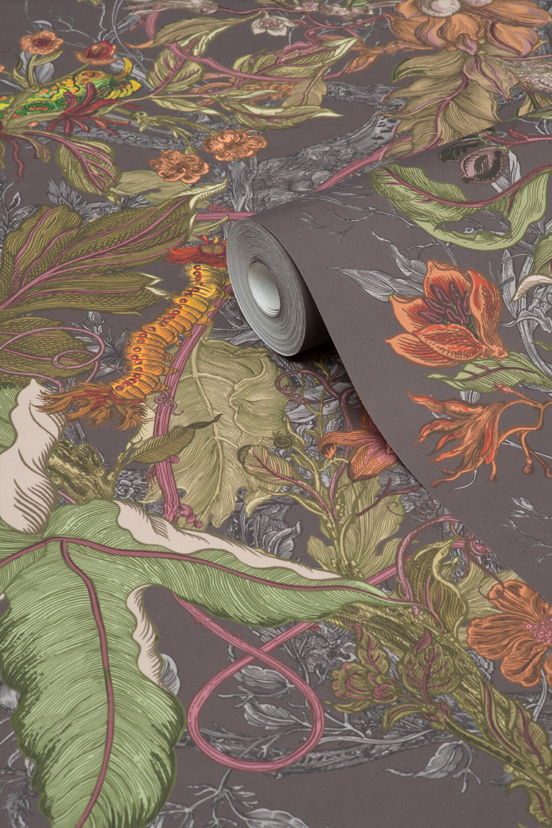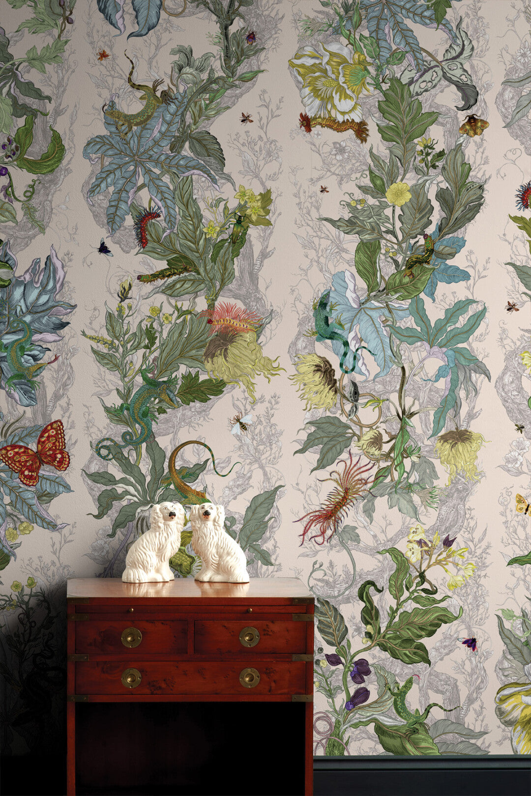 Indie Jungle Wallpaper reinterprets the classic Indie Wood pattern in a tropical theme. A dense canopy of flowers, leaves, butterflies and gecko's shows a vibrant jungle landscape.