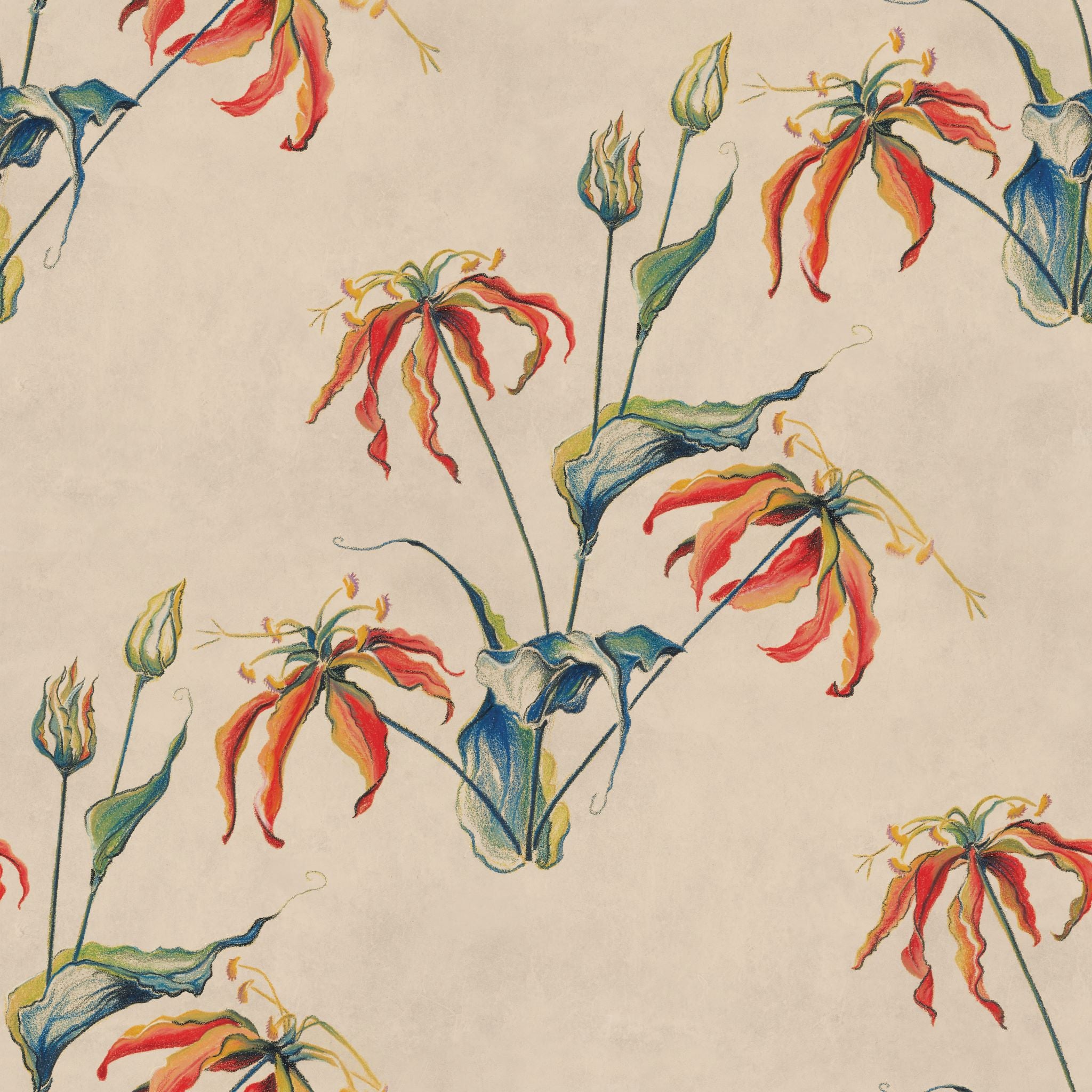 The Aubrey pattern is a whimsical gloriosa lily drawing on a textural stone background. This design brings a warm and natural feeling to your space with pops of beautiful coral and cobalt blue.