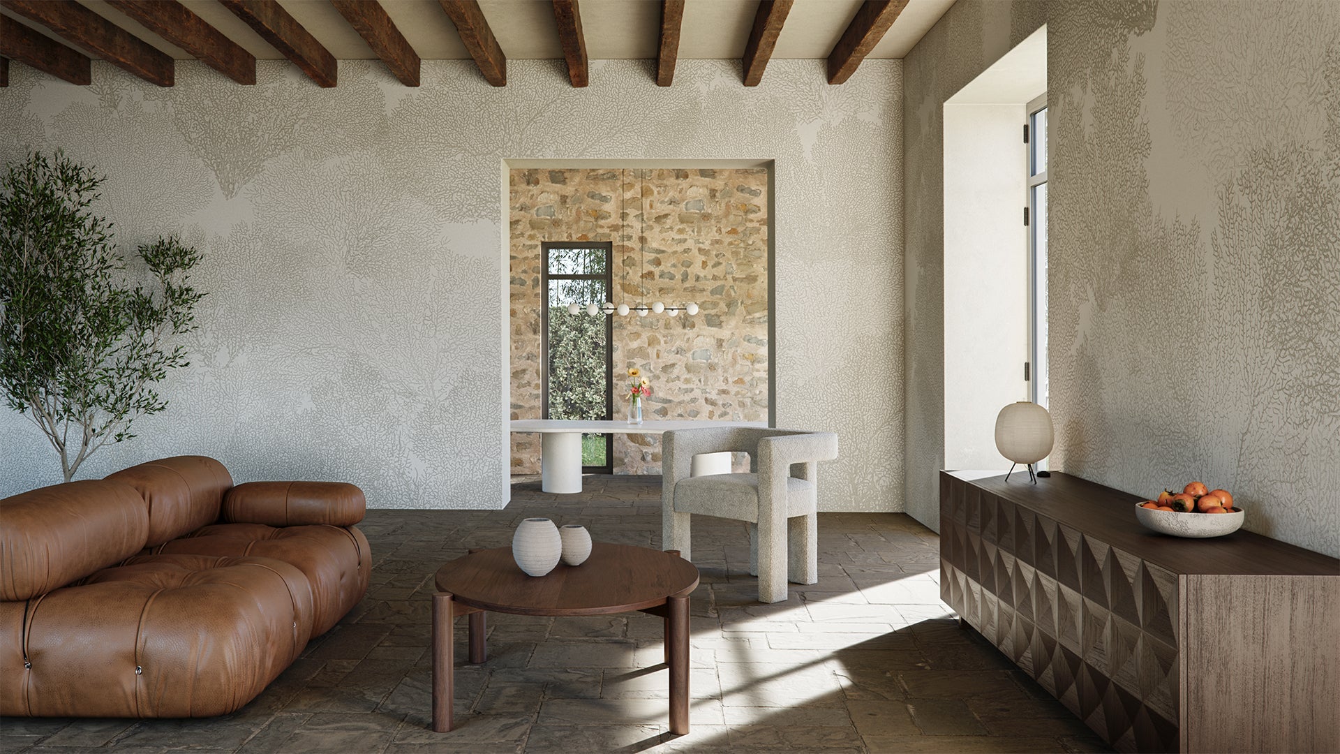 Calico Wallpaper’s Corallina shows the shells and coral shaped by time, water, and light. Using real coral and abalone, they created hand assembled collages that capture the texture and movement of the sea. Translated into wallpaper, these designs reflect the ocean’s organic beauty.