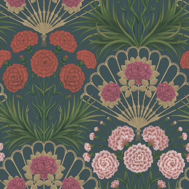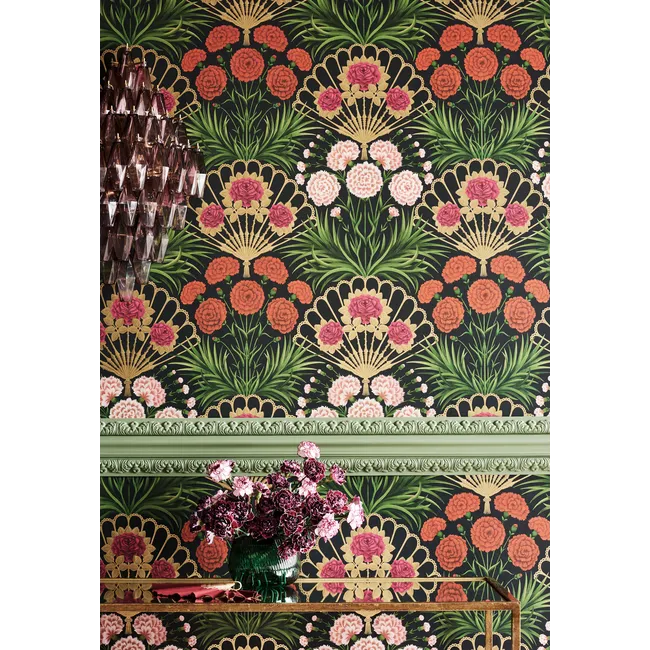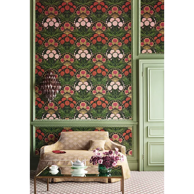 A refined botanical wallpaper featuring elegant fan motifs, lush green foliage, and soft floral blooms in warm, vintage-inspired tones. This decorative design blends classic ornamentation with natural elements, adding timeless charm and sophistication to any interior.