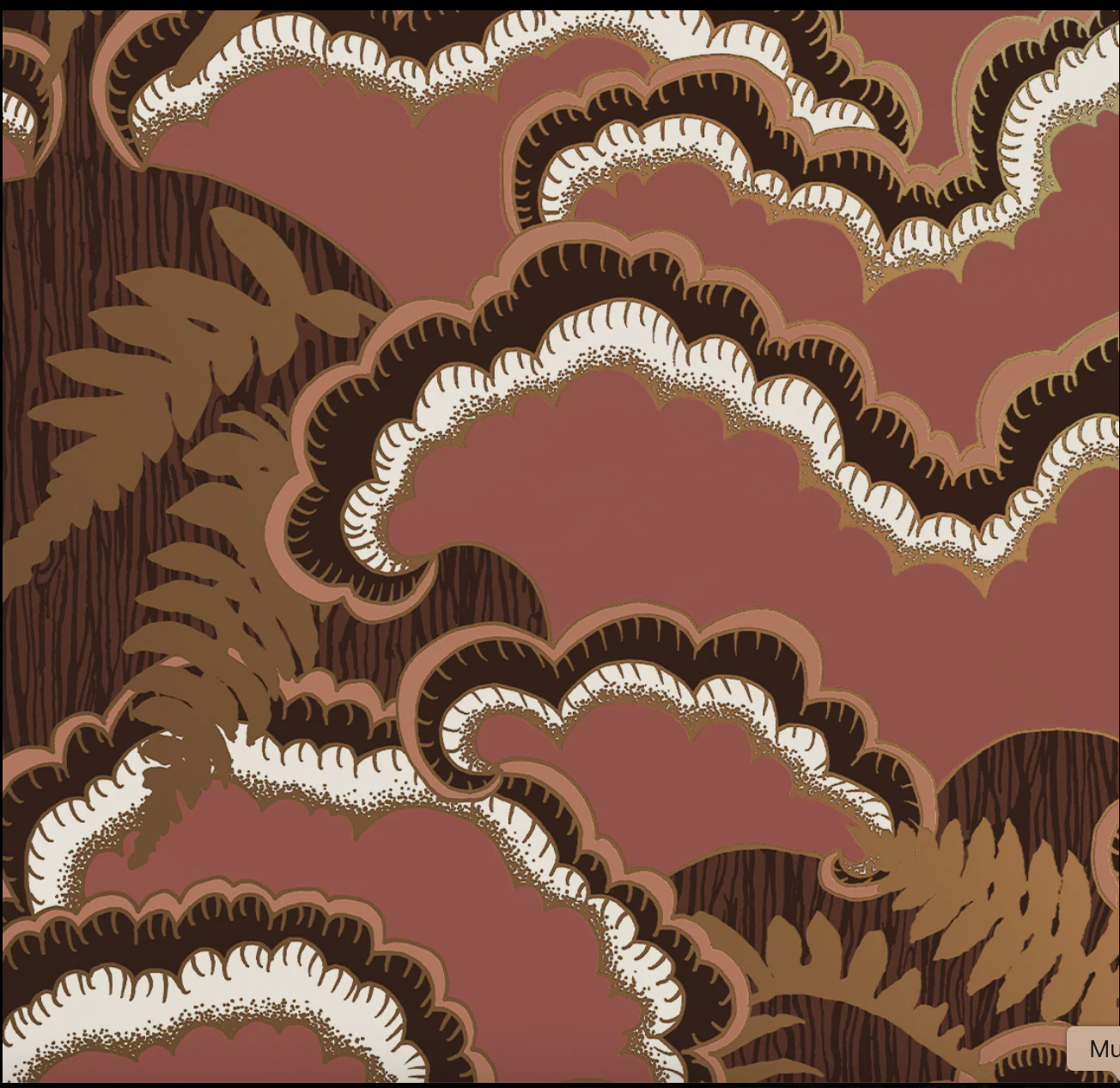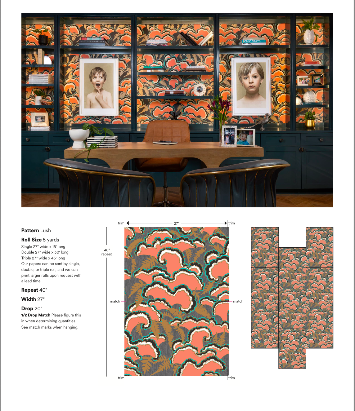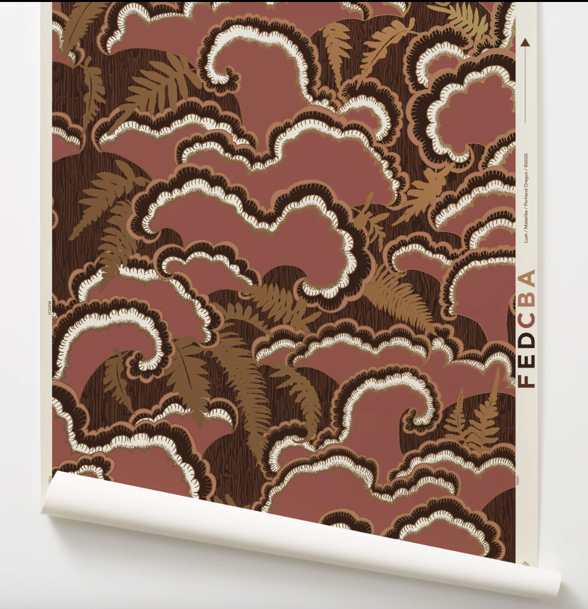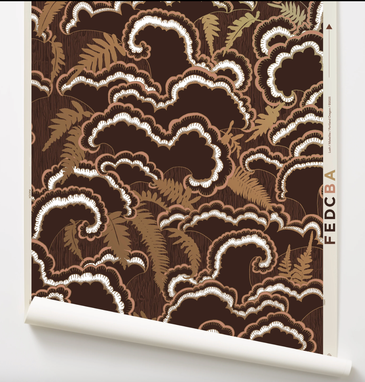 The Lush wallpaper pattern was inspired by mushrooms and ferns and tree stumps observed on many walks. Lush transcends architectural styles by being contemporary, mid century, art deco and organic depending on its use and surrounding. The background has a subtle faux bois wood grain.