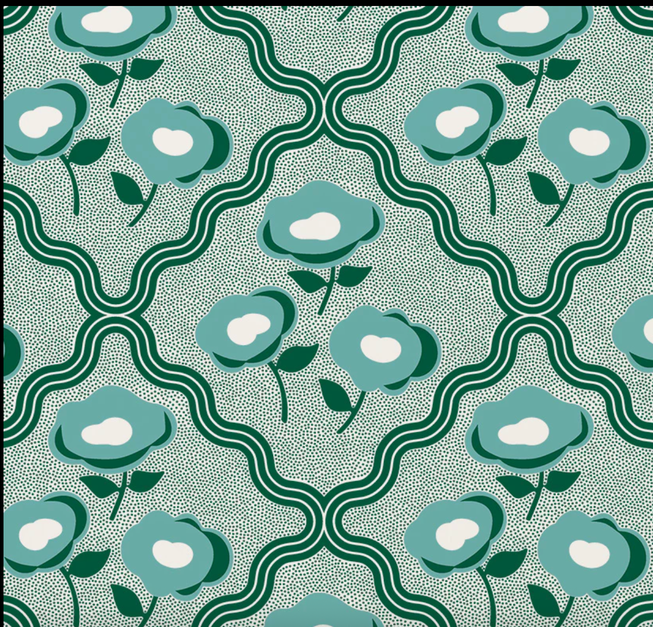 Wave wallpaper is a modern take on vintage flour sack prints from the 1930s and ’40s. The wave pattern has a heritage feel with classic colors like the milk glass green and deep mauve which they call burgundy.